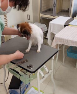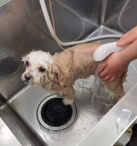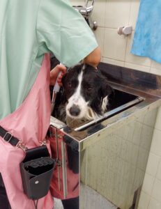 キレイに洗ってもらっています。この後爪切り・耳掃除・肛門絞り・足回りカット等をしてもらいます。