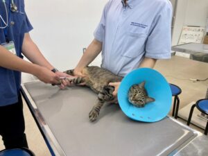 もちろん、知識だけではなく技術も身につけましょう!猫ちゃんの採血時の保定と、なぜかカメラ目線のこてつ君です(笑