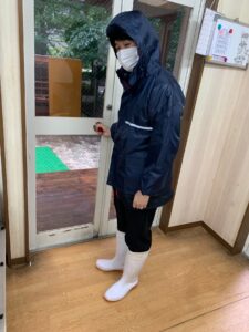 大雨の中、屋外飼育のヤギやアヒルたちのお世話を行ってくれた T先生 も、この通り。